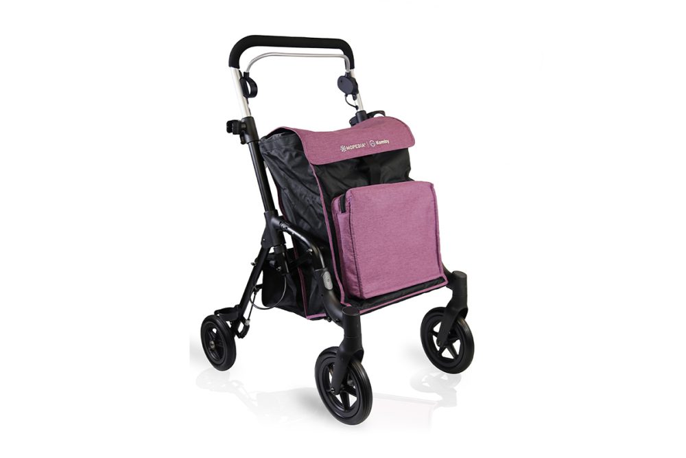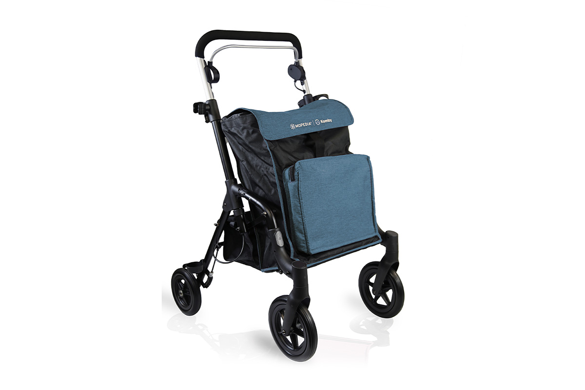 Rollator plegable de aluminio pintado para exteriores, especialmente indicado para ir de compras. Equipado con ruedas delanteras giratorias Ø 20 cm y ruedas traseras fijas Ø 18 cm. Dispone de una única manillar de empuje y un freno de palanca única en las ruedas traseras. Ajustable en altura y con una capacidad de hasta 15 kg. Incluye bolsillo delantero térmico, posterior de la guantera, soporte para bastón y soporte para botella. Fácil de plegar, ocupa muy poco espacio cuando no se utiliza.